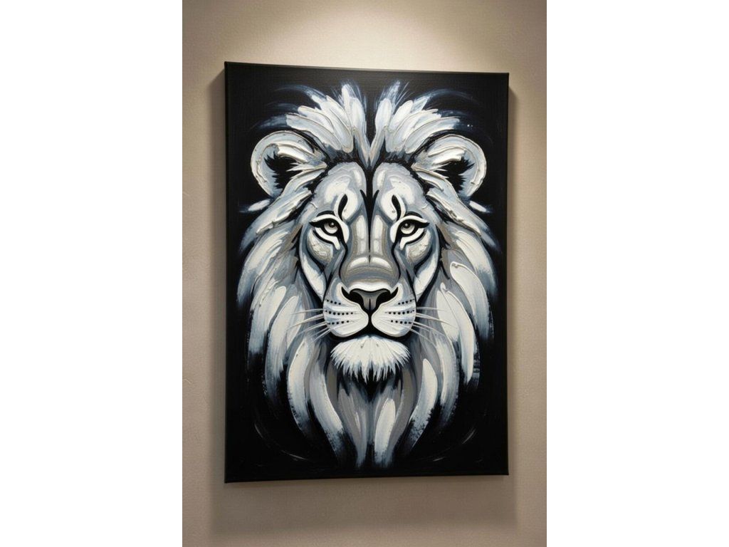 • Barevná paleta: Čistá monochromatická kombinace. Hluboká černá v pozadí dává vyniknout odstínům bílé, stříbřité a šedé, které tvoří lví hřívu. Díky vysokému kontrastu obraz působí velmi dynamicky.